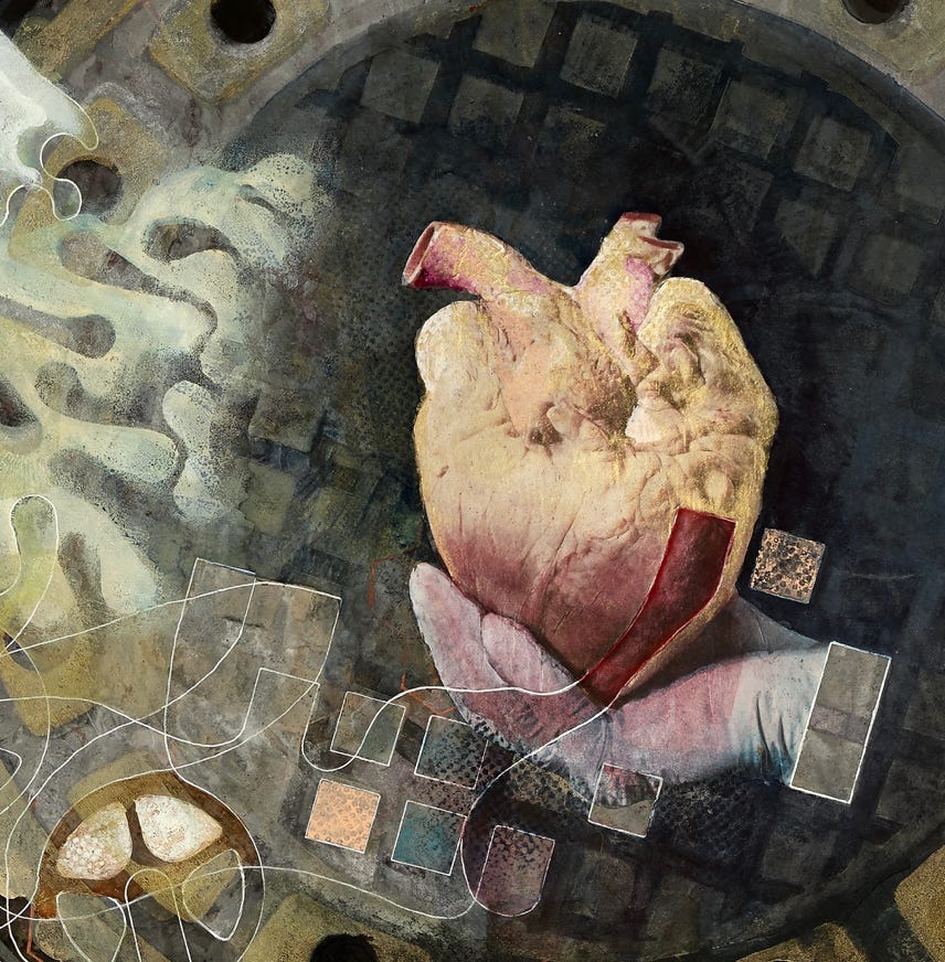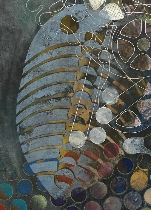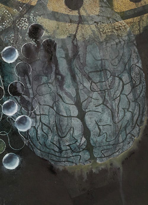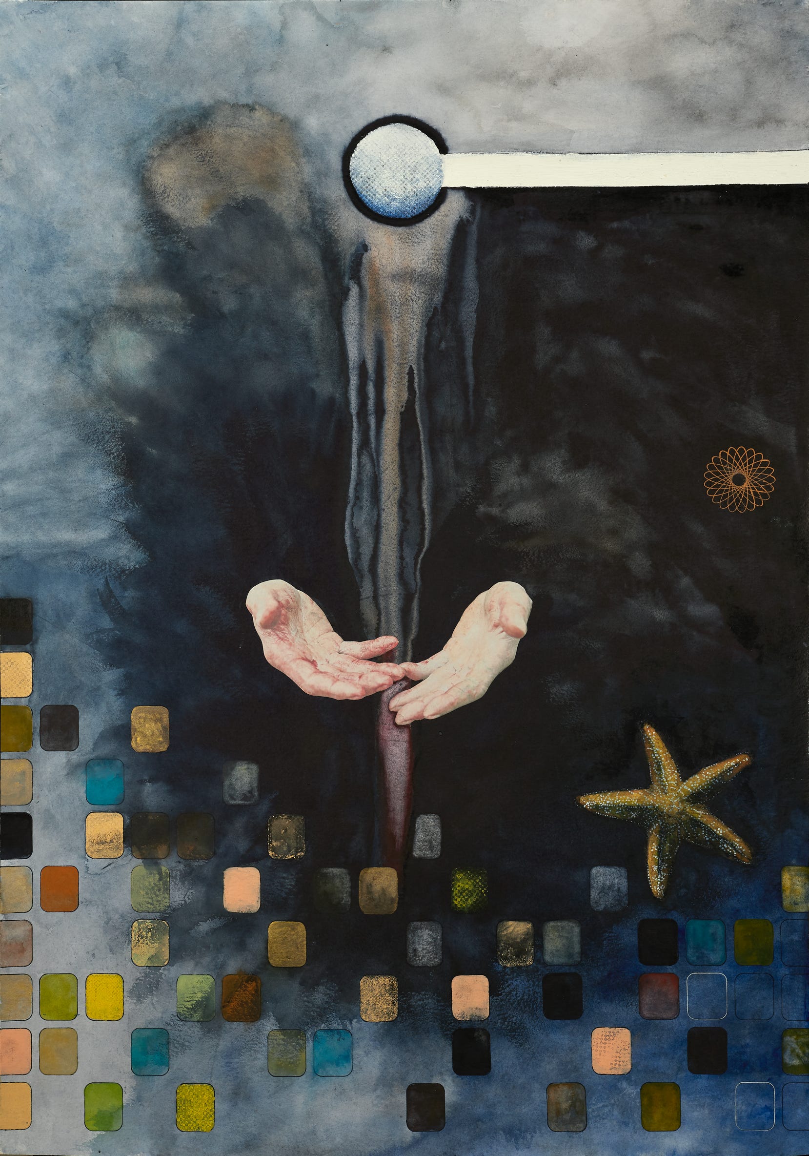 Grundlage meiner darstellenden Kompositionen sind lineare Loops, die wiederum aus vorgegebenen Schablonen entstehen. Sie haben einen konstruktivistischen retrospektiven Charakter und bilden eine Art Netzwerk für mein kreatives Spiel. Ich arbeite einerseits mit Aquarell-, andererseits mit Ölfarben. Beide Substanzen stoßen sich ab und bilden oft zufällig reizvolle Strukturen. Neben meiner abstrakten Formensprache benutze ich Drucke, die ich als Platten vorgefertigt habe. Bevorzugte Motive sind fossile, bakterielle, planetaren oder neuronale Strukturen. Je nach Vorgang und Vorlagen füge ich Fotos hinzu, die ich im Bild verarbeite. Die fertigen Bilder, die sich am Ende entfalten, klingen wie unverständliche Erzählungen, moderne Bühnenbilder, kosmische Nebel und dunkle Mysterien. Ihren Sinn findet der Betrachter subjektiv im Verweilen vor dem Bild. Die Hochformate wirken dabei manchmal wie Tarotkarten der großen Arkana, in denen eine tiefere Bedeutung mitschwingen kann. Die Größe der Bilder beträgt 100 x 70 cm. Es sind Bilder auf Papier und brauchen für die Hängung einen Glasrahmen.