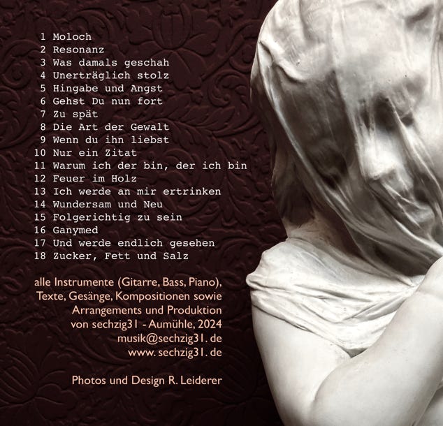 Meine Lyrik in den Liedern ist erfüllt mit dunkler Poesie. Dabei pendelt das Genre der Musik zwischen Akustik-Chansons und rockigem Cabaret. Instrumental stehen Gitarren, Bass und Orgelklänge im Vordergrund der Songs. Der Gesang ist oft mehrstimmig angelegt und betont in seiner Dunkelheit die Erzählungen. Bemerkenswert sind die Bruchstellen meiner schwarz-eingefärbten Reim- und Wortspiele. Diese Ungenauigkeit ist das Pendant zu der perfiden und perfektionistischen Konsumgesellschaft. Letztere will uns verzaubern, manipulieren durch Leistung und Vollkommenheit. Dabei baut das Leben und die Evolution auf Fehlerhaftigkeit. Die Inhalte meiner Texte stellen einerseits missglückte, unsichtbare und nächtliche Schicksale in den Mittelpunkt, andererseits die geldgierigen Menschen der Exzesse mit ihren Exkrementen und ihrer Vermüllung des Alltags. Die Kunst der Reime, Metaphern und Alliterationen sind mit der musikalischen Komposition verwoben. Diese steht bei mir stets am Anfang der Aufnahme in die Computersoftware. Ich komponierte die letzten Jahre fast ausschließlich mit Akustikgitarre.