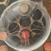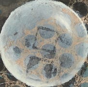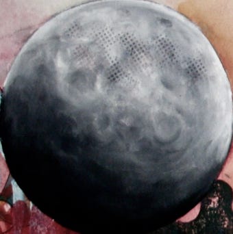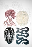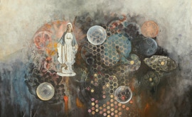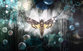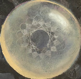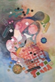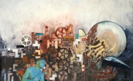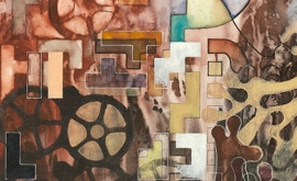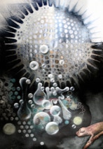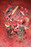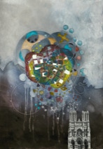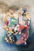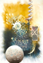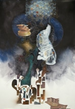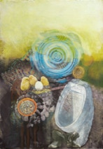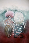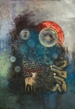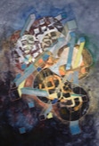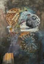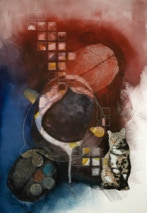 Grundlage meiner darstellenden Kompositionen sind lineare Loops, die wiederum aus vorgegebenen Schablonen entstehen. Sie haben einen konstruktivistischen retrospektiven Charakter und bilden eine Art Netzwerk für mein kreatives Spiel. Ich arbeite einerseits mit Aquarell-, andererseits mit Ölfarben. Beide Substanzen stoßen sich ab und bilden oft zufällig reizvolle Strukturen. Neben meiner abstrakten Formensprache benutze ich Drucke, die ich als Platten vorgefertigt habe. Bevorzugte Motive sind fossile, bakterielle, planetaren oder neuronale Strukturen. Je nach Vorgang und Vorlagen füge ich Fotos hinzu, die ich im Bild verarbeite. Die fertigen Bilder, die sich am Ende entfalten, klingen wie unverständliche Erzählungen, moderne Bühnenbilder, kosmische Nebel und dunkle Mysterien. Ihren Sinn findet der Betrachter subjektiv im Verweilen vor dem Bild. Die Hochformate wirken dabei manchmal wie Tarotkarten der großen Arkana, in denen eine tiefere Bedeutung mitschwingen kann. Die Größe der Bilder beträgt 100 x 70 cm. Es sind Bilder auf Papier und brauchen für die Hängung einen Glasrahmen.
